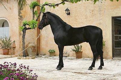 És un animal de caràcter tranquil, fort, rústic i molt sobri. És de conformació eumètrica, sublongilini i de perfil fronto-nasal lleugerament convex. La seva silueta és esvelta i el color de la seva capa és negra. Característiques més destacades El cap és allargat, sec i descarnat, de grandària mitjana tirant a grossa, amb les orelles petites, dretes i quasi sempre plenes de pèl. Els ulls són foscs i ben manifests per lo marcades que són les arcades orbitals. El morro és ample i fort amb els oronells poc destacats. El coll és curt, i encara que profund no és gaire ample. La cabellera és abundant i el pèl és fort i gruixat. Té un pit ample i el costellam arquejat. L’esquena és recte, malgrat té tendència a ensellar-se amb l’edat. La gropa és llarga i inclinada i, en general de musculatura plana. Les extremitats són ben aplomades, poc musculades , amb travadors llargs i oblics, ben dotats de pèl i amb els genolls i garrons forts i amples. Els potons són també amples i forts. La coa és de inserció baixa, llarga i de pèl llarg i fort. El color del pèl és el negre, en totes les seves variants, el que li dona un aspecte elegant i seriós. S'accepten petites taques blanques a la cara en forma d'estel o cordó.